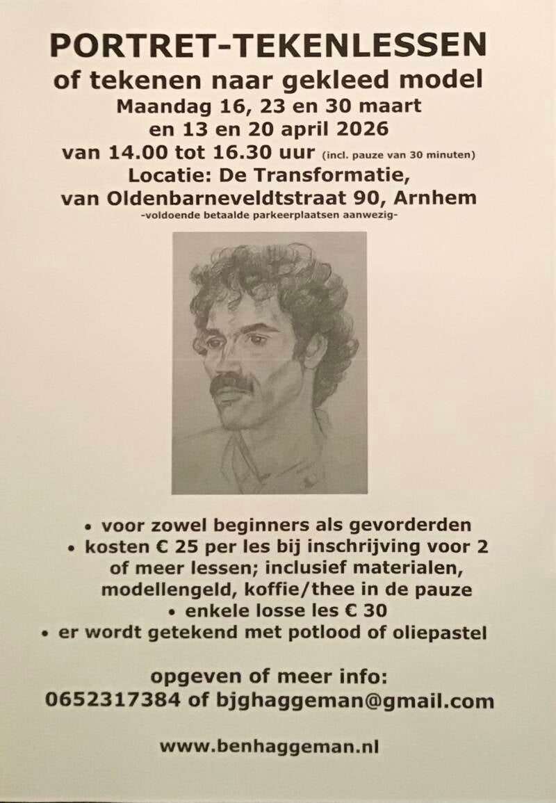 De komende weken geef ik weer portret-tekenlessen. Omdat de groep klein is, geef ik individueel les. Dus of je nu je eerste les wilt of al jarenlang portret tekent, de aanwijzingen zijn aan jouw niveau aangepast. In de kosten zijn de materiaalkosten, waaronder papier, en modelkosten inbegrepen. Er wordt getekend naar gekleed model, met potlood, grafiet of pastel. De lessen worden gegeven in de workshopruimte van de Transformatie. Dit is het gebouw waar ik ook mijn atelier heb. Meer info of meedoen? Bel of app mij 0652317384